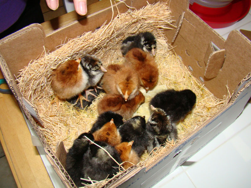 Our chicks from Meyer Hatchery in Ohio hatched early Monday morning and shipped a few hours later. They arrived at our post office this (Wednesday) morning around 8:30 a.m., and were being settled in their new home by 9:00. One died in transit, but the others all look healthy at this stage: six Rhode Island Reds, three Barred Rocks, three Silver Laced Wyandottes, and two Black Australorps. They seem to be taking to the three main chick functions (drinking, eating, pooping) with gusto! It’s fascinating to watch them. Pictures above show them in the box they arrived in and then in our makeshift brooder for the first week or so.